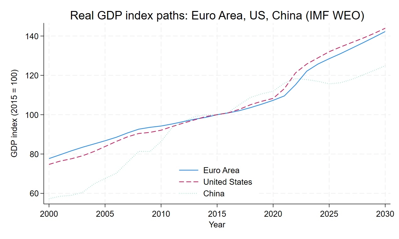 Figure 1: Figure X. Real GDP index paths: Euro Area, United States and China,  2000-20230. Real GDP index, 2015=100 (IMF WEO October 2024 projections). Shaded area (2024-2030) denotes IMF projections. Source: IMF World Economic Outlook database, October 2024.